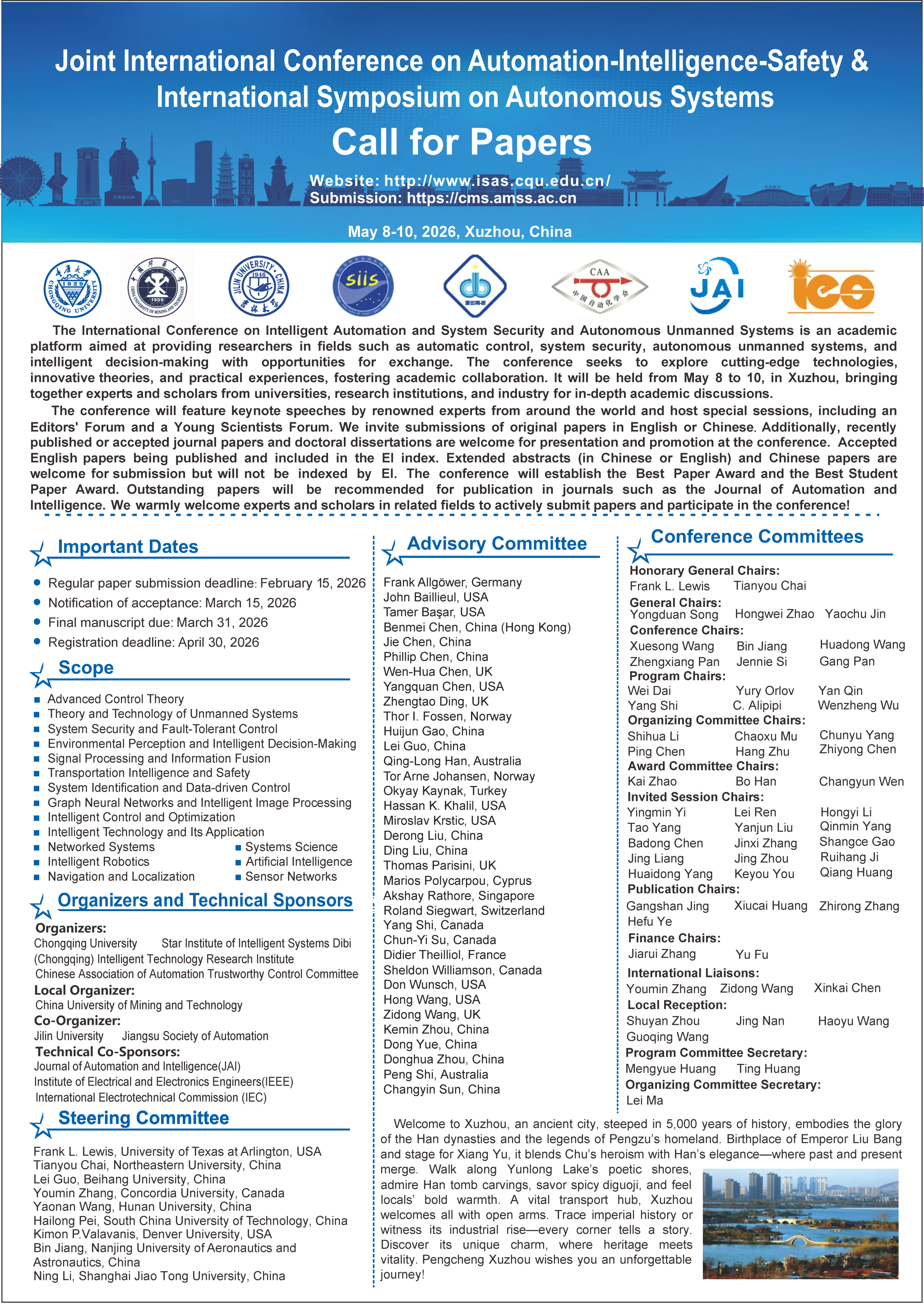 The International Conference on Intelligent Automation and System Security and Autonomous Unmanned Systems is an academicplatform aimed at providing researchers in fields such as automatic control, system security, autonomous unmanned systems, and intelligent decision-making with opportunities for exchange. The conference seeks to explore cutting-edge technologies, innovative theories, and practical experiences, fostering academic collaboration. It will be held from May 8 to 10, in Xuzhou, bringing together experts and scholars from universities, research institutions, and industry for in-depth academic discussions.